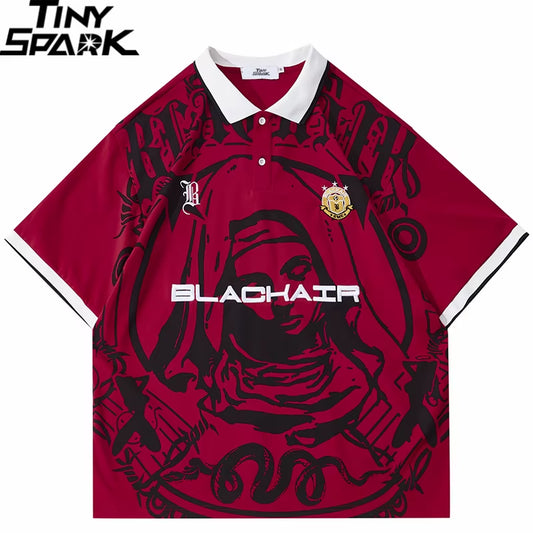 Men Hip Hop Streetwear Polo T-Shirt Virgin Mary Graphic Embroidery 2024 Summer Oversized Polo Shirt Retro Casual Cotton Tops Tee